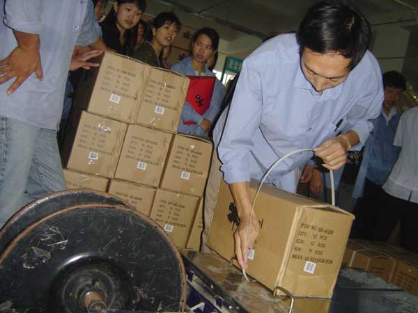 看着产品传送带上,每道工序上的员工都在加紧做着,个别手脚快的员工还不时看看前一道工序,或者催促一下,看那表情似乎已经等不及想帮忙做。削笔器组装项目的比赛就在这种紧张的气氛中展开了,同时也拉开了自定义项目比赛的帷幕。看着第一组选手正在加紧赶工,各道工序有条不紊、环环相扣,第二组选手却在旁边或做着准备工作,或三三两两悄悄地在讨论着什么,时间在这时仿佛过的特别的慢,有些选手额头微微的出了些汗,抿着嘴,加紧做着手中的活。