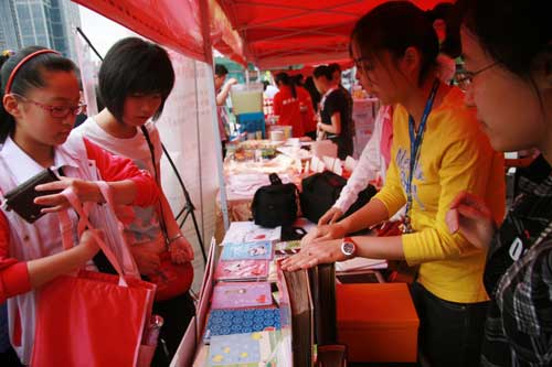 活动在上午8时30分开始,30多所中小学的学生们早早地摆起了爱心义卖摊。来自江北实验中学的学生站在凳子上,用大喇叭热情地“叫卖”着,希望大家去购买他们带来的爱心义卖物品;市聋哑学校的学生把自己制作的油画、京剧脸谱、插花、刺绣等带到现场,希望用自己的劳动成果为慈善事业贡献一分力量;40多位慈善义工则抱着爱心捐款箱来回穿梭,向过往的市民劝募,一个个忙得满头大汗。在活动现场,农夫山泉的饮料、天一豪食汇的点心、广博的文具也卖得火热,他们的义卖所得全部捐给了慈善总会。