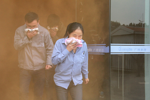 11月9日下午,广博股份公司辅料车间一楼大门内突然冒出一股浓浓的黄色烟雾,紧接着陆陆续续从浓烟中冲出数十名工人,他们个个都弯着腰,弓着背,手拿毛巾捂着口鼻,跑出来后统一在车间门前的开阔地上相互交流着从车间里“逃”出来的感受。上前一打听才知道,原来是广博集团正在开展一年一度的消防安全逃生技能现场摹拟演练。
