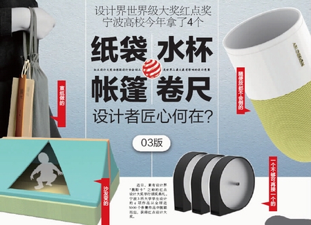 这4项获奖作品分别为:宁波诺丁汉大学学生设计的户外水杯及沙发帐篷,宁波大学科技学院学生设计的特殊卷尺,浙江大学宁波理工学院学生设计的谦牧宣纸礼品包装设计。