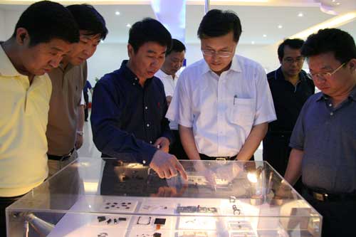 5月23日,山东省日照市市长杨军等领导在鄞州区领导的陪同下参观广博集团,并在会议室进行亲切座谈。图为王利平董事长向杨市长介绍公司产品零件。