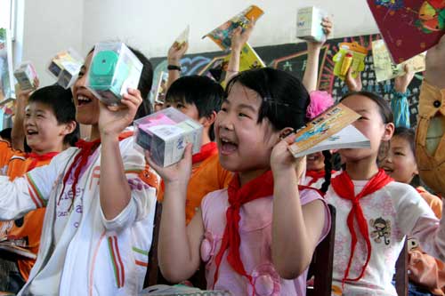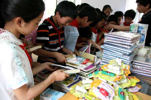 5月24日,广博集团与鄞州区图书馆联合举办“广博文具献爱心”活动,让“广博爱心基金”专列再一次驶进了山区,来到了鄞州的最西边大雷和竹丝岚小学,为他们送去了笔记本、削笔器、订书机等文具用品,这是广博党委爱心基金自去年成立后为学生送文具的第五站。
