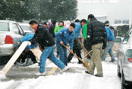 这两天,大雪纷纷扬扬下个不停,就像给甬城辅了一层厚厚的棉絮。广博工业园区的地面、建筑以及树木全是银装素裹,加之头天夜里已下了一整夜,地上的积雪已有五厘米厚。为保持正常的生产、生活秩序,2日上午刚上班,公司领导便组织各部门员工到厂区清扫积雪。