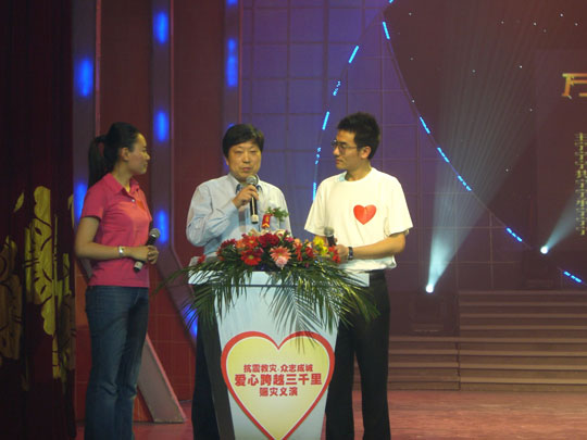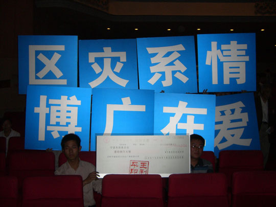 由《宁波晚报》联合市慈善总会等七家单位举办的 “爱心跨越三千里”大型赈灾义演在逸夫剧院举行。远在国外的广博集团董事长以个人名义又捐款18万元,与广博全体员工募捐的17余万元共同表达一个心愿:在四川灾区建一所广博希望小学。满载全体广博人的这片爱心和真情,公司领导积极参与了此活动。 记者获悉,市慈善总会昨日将首批抗震善款1200万元汇往四川省慈善总会,用于汶川县的抗震救灾。同时,市慈善总会仍在继续收到众多爱心捐款。昨日,市慈善总会接收救灾捐款350万元,捐款者达450人次,个人捐款数额在1000元至10000元的有45人次。另据统计,各县(市)区慈善总会共收到社会各界捐款1346万元。 昨晚,市慈善总会、市文广新闻出版局、团市委、市青联、市企业家协会等单位在逸夫剧院共同举办“爱心跨越三千里”大型赈灾义演,许多前来观看的爱心人士和企业纷纷捐款,为灾区人民祝福。义演所得的734万元捐款将统一由市慈善总会转交地震灾区。
