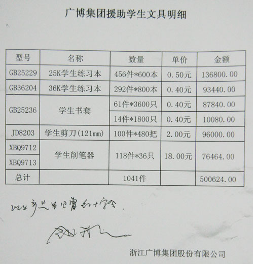 据了解,自四川汶川发生强烈地震并造成重大人员伤亡和财产损失以来,严重的灾情一直牵动着广博人的心。公司董事长王利平得知消息后,连夜打来越洋电话,向四川地震灾区捐助100万元的款项和文具的同时,他个人又捐款18万元。公司的全体员工也积极捐款,慷慨解囊,充分发扬了“一方有难,八方支援”的中华民族传统美德,向灾区群众传递广博的一份爱心,一片真情。
