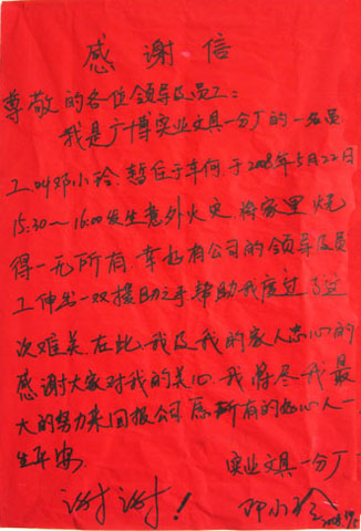 近日,在广博车间工作的四川安岳县人邓小玲,向公司领导送来一封她亲笔书写的感谢信。