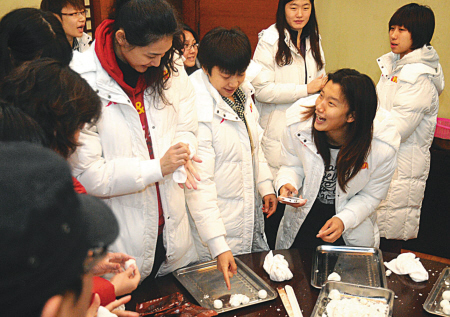 下午5时多,收拾一新的姑娘们来到了潘火管委会(投创中心)办公楼。第一个节目自然是包汤圆。球员们基本上来自北方,没有包过汤圆。“我咋怎么捏这个面团都是方的呀?”陈伟昕惊呼。球员们包出来的汤圆形状各异,比如邵婷婷的作品,被主持人称为“穿山甲”。主教练隋菲菲在旁乐,“我呆会不敢吃了啊”。球员们倒是一点也没有感到不好意思,拿着自己的作品在那合影留念。领队刘玉栋索性站到凳子上,拿着手机给队员们拍照。