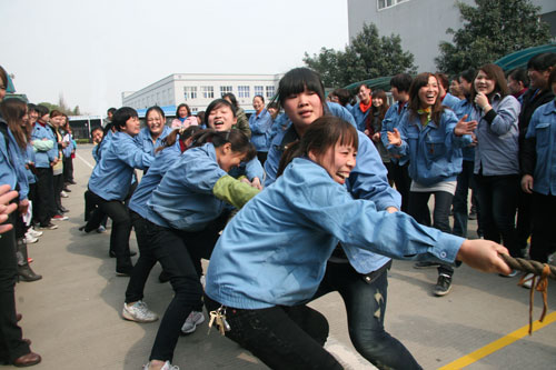 下午两点多,厂区主干道拔河场地上,已是人头攒动,全厂在岗女职工们欢聚一起,眉飞色舞。在集团公司行政总裁热情洋溢地向集团女职工致以节日的问候和祝福后,广博集团“庆三·八”拔河比赛在一片掌声中拉开序幕。