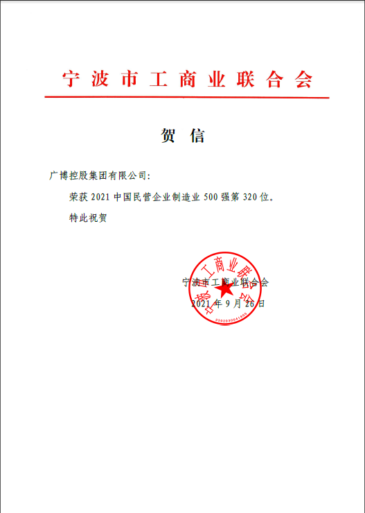 广博控股集团有限公司荣获2021年中国民营企业制造业500强第320位
